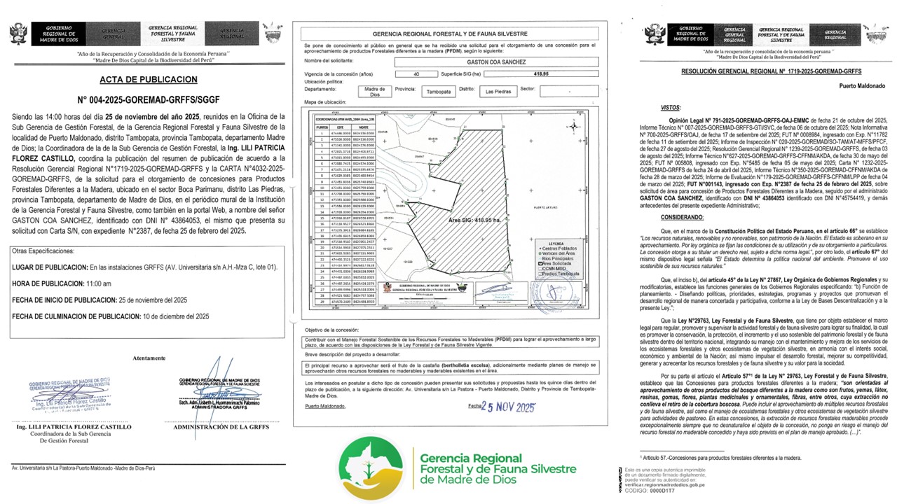 La Opinión Legal Nº791-2025-GOREMAD-GRFFS-OAJ-EMMC de fecha 21 de octubre del 2025, Informe Técnico Nº007-2025-GOREMAD-GRFFS-GTI/SVC, de fecha 06 de octubre del 2025 ; Nota Informativa Nº700-2025-GRFFS/OAJ, de fecha 17 de setiembre del 2025; FUT Nº0008984, ingresado con Exp. Nº11782 de fecha 11 de setiembre del 2025; Informe de Inspección Nº 020-2025-GOREMAD/SO-TAM/AT-MFFS/PFCF de fecha 27 de agosto del 2025; Resolución Gerencial Regional Nº1239-2025-GOREMAD-GRFFS, de fecha 03 de agosto del 2025; Informe Técnico Nº627-2025-GOREMAD-GRFFS-CFFNM/AKDA, de fecha 30 de mayo del 2025; FUT Nº 005808, ingresado con exp. Nº5485 de fecha 05 de mayo del 2025; Carta Nº 1232-2025-GOREMAD-GRFFS de fecha 24 de abril del 2025, Informe Técnico Nº350-2025-GOREMAD-CFFNM/AKDA de fecha 28 de marzo del 2025; Informe de Evaluación Nº179-2025-GOREMAD-GRFFS-CFFNM/LPP de fecha 04 de marzo del 2025; Nº001143, ingresado con Exp. Nº2387 de fecha 25 de febrero del 2025, sobre solicitud de área para concesión de Productos Forestales Diferentes a la Madera, seguido por el administrado GASTON COA SANCHEZ identificado con DNI Nº45754419 y demás antecedentes del presente expediente administrativo.
