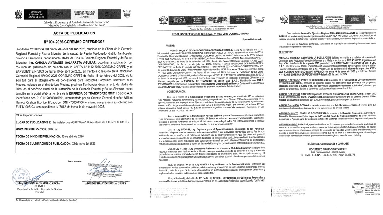 Siendo las 12:00 horas del día 17 de abril del año 2026, reunidos en la Oficina de la Gerencia Regional Forestal y Fauna Silvestre de la ciudad de Puerto Maldonado, distrito Tambopata, provincia Tambopata, departamento Madre de Dios; la Gerente Regional Forestal y de Fauna Silvestre, Ing. CAROLA ANTUANET GALARRETA AGUILAR, coordina la publicación del resumen de publicación de acuerdo con la CARTA N°1112-2026-GOREMAD-GRFFS y el EXPEDIENTE N°3963 de fecha 10 de abril del 2026, en mérito a lo resuelto en la Resolución Gerencial Regional N°0099-2026-GOREMAD-GRFFS de fecha 18 de febrero del 2026, de la solicitud para el otorgamiento de concesiones para Productos Forestales Diferentes a la Madera, ubicado en el distrito Las Piedras, provincia Tambopata, departamento de Madre de Dios, en el periódico mural de la Institución de la Gerencia Forestal y Fauna Silvestre, como también en la portal Web, a nombre de la EMPRESA DE TRANSPORTE SMITH C&C S.A.S, identificada con RUC N°20609045991, representado por su Gerente General el señor William Hancco Ccahuantico, identificado con DNI N°60804338, el mismo que presenta su solicitud con FUT N°006223, con expediente N°6012, de fecha 14 de mayo del 2025.