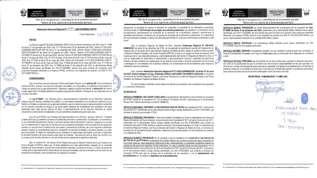 La administrada Milady Nahisbit Inuma Apaza, identificada con DNI Nº 72020899, solicita área para contrato de concesión para productos forestales diferentes a la madera (PFDM), conforme a los requisitos de acuerdo a la RDE Nº 105-2016-SERFOR/DE.