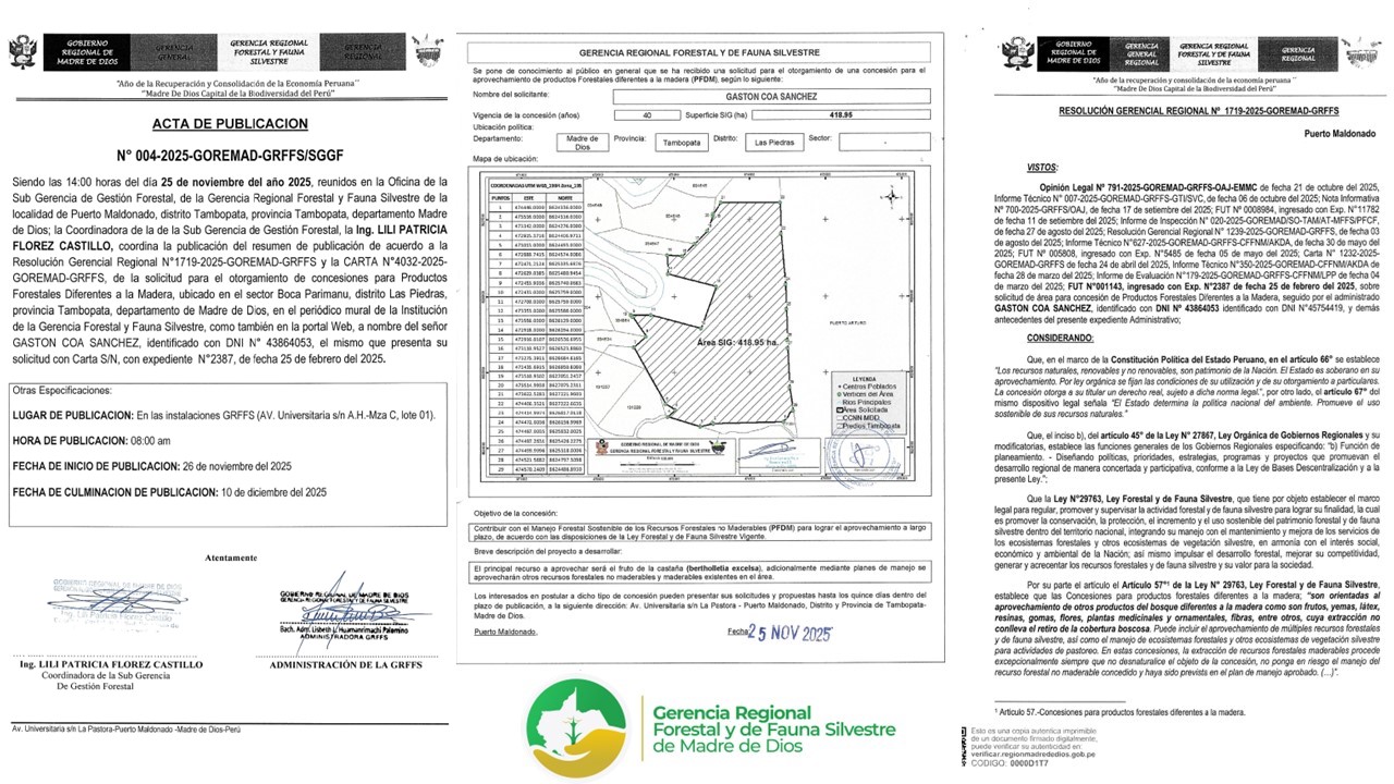 La Opinión Legal Nº791-2025-GOREMAD-GRFFS-OAJ-EMMC de fecha 21 de octubre del 2025, Informe Técnico Nº007-2025-GOREMAD-GRFFS-GTI/SVC, de fecha 06 de octubre del 2025 ; Nota Informativa Nº700-2025-GRFFS/OAJ, de fecha 17 de setiembre del 2025; FUT Nº0008984, ingresado con Exp. Nº11782 de fecha 11 de setiembre del 2025; Informe de Inspección Nº 020-2025-GOREMAD/SO-TAM/AT-MFFS/PFCF de fecha 27 de agosto del 2025; Resolución Gerencial Regional Nº1239-2025-GOREMAD-GRFFS, de fecha 03 de agosto del 2025; Informe Técnico Nº627-2025-GOREMAD-GRFFS-CFFNM/AKDA, de fecha 30 de mayo del 2025; FUT Nº 005808, ingresado con exp. Nº5485 de fecha 05 de mayo del 2025; Carta Nº 1232-2025-GOREMAD-GRFFS de fecha 24 de abril del 2025, Informe Técnico Nº350-2025-GOREMAD-CFFNM/AKDA de fecha 28 de marzo del 2025; Informe de Evaluación Nº179-2025-GOREMAD-GRFFS-CFFNM/LPP de fecha 04 de marzo del 2025; Nº001143, ingresado con Exp. Nº2387 de fecha 25 de febrero del 2025, sobre solicitud de área para concesión de Productos Forestales Diferentes a la Madera, seguido por el administrado GASTON COA SANCHEZ identificado con DNI Nº45754419 y demás antecedentes del presente expediente administrativo.