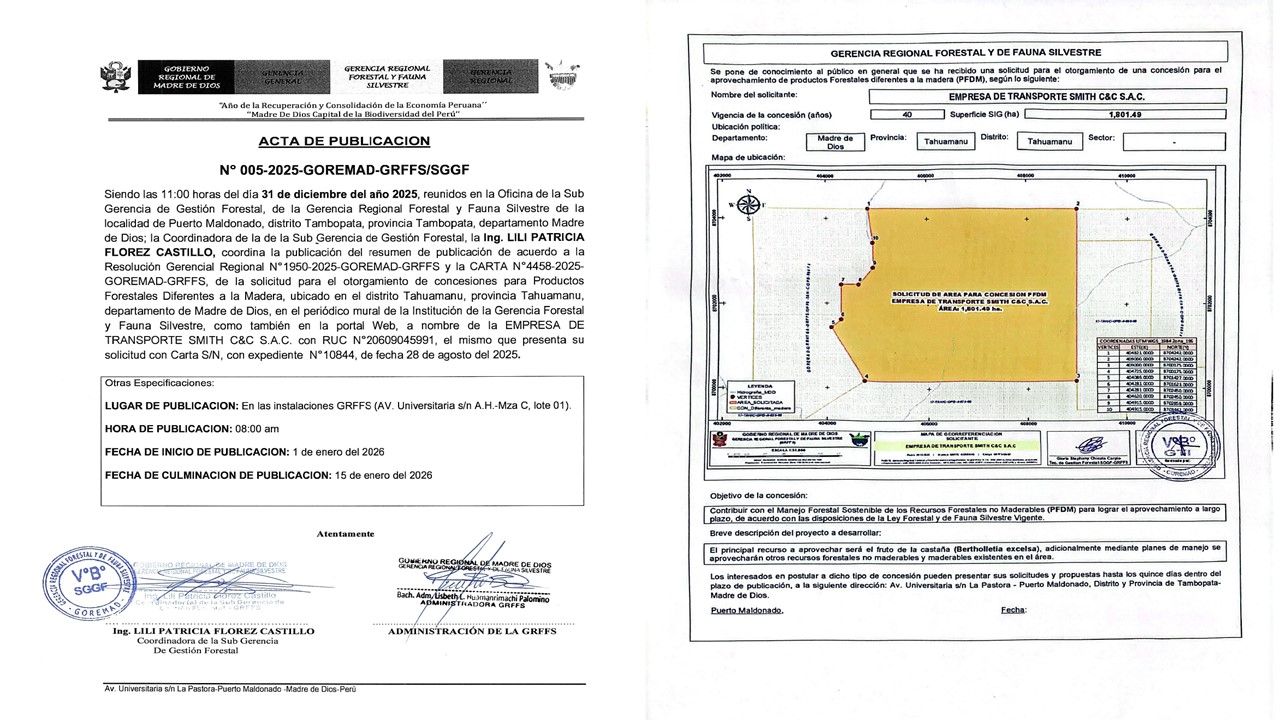 Siendo las 11:00 horas del día 31 de diciembre del año 2025, reunidos en la Oficina de la Sub Gerencia de Gestión Forestal, de la Gerencia Regional Forestal y Fauna Silvestre de la localidad de Puerto Maldonado, distrito Tambopata, provincia Tambopata, departamento Madre de Dios; la Coordinadora de la de la Sub Gerencia de Gestión Forestal, la Ing. LILI PATRICIA FLOREZ CASTILLO, coordina la publicación del resumen de publicación de acuerdo a la Resolución Gerencial Regional N°1950-2025-GOREMAD-GRFFS y la CARTA N°4458-2025-GOREMAD-GRFFS, de la solicitud para el otorgamiento de concesiones para Productos Forestales Diferentes a la Madera, ubicado en el distrito Tahuamanu, provincia Tahuamanu, departamento de Madre de Dios, en el periódico mural de la Institución de la Gerencia Forestal y Fauna Silvestre, como también en la portal Web, a nombre de la EMPRESA DE TRANSPORTE SMITH C&C S.A.C. con RUC N°20609045991, el mismo que presenta su solicitud con Carta S/N, con expediente N°10844, de fecha 28 de agosto del 2025.