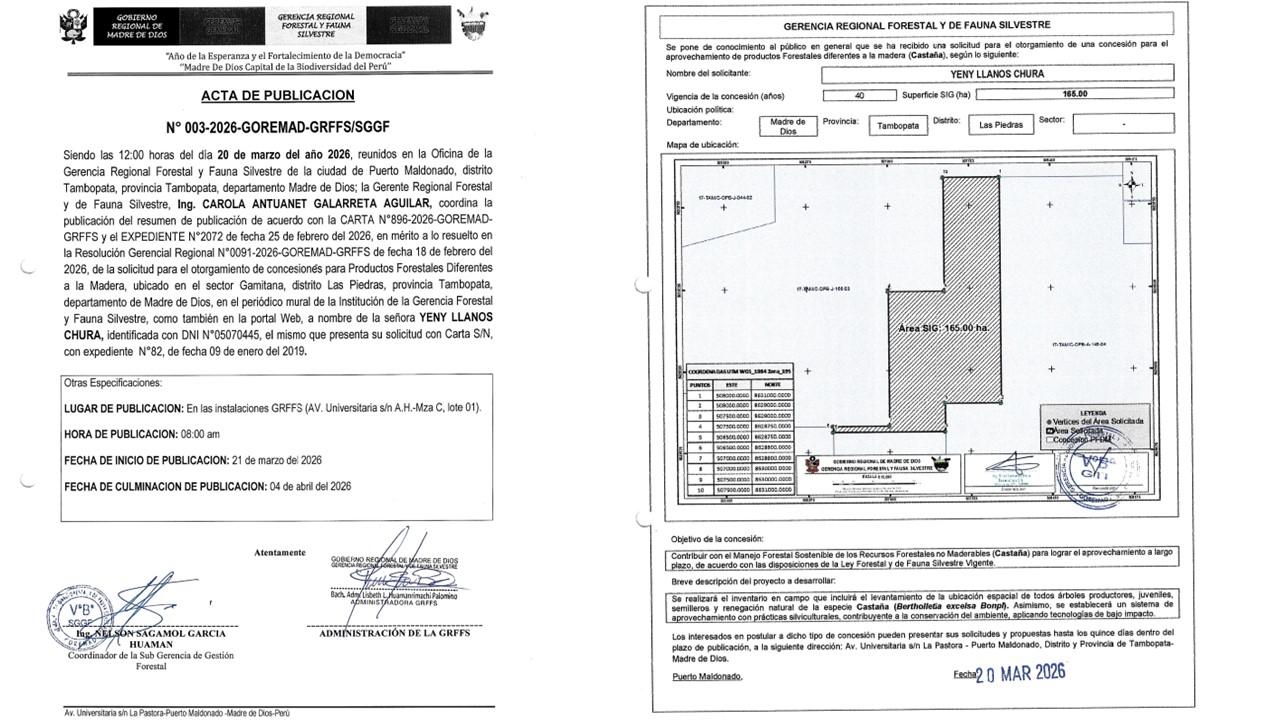 Siendo las 12:00 horas del dia 20 de marzo del año 2026, reunidos en la oficina de la Gerencia Regional Forestal y de Fauna Silvestre de la ciudad de Puerto Maldonado, distrito Tambopata, provincia Tambopata, departamento Madre de Dios; la Gerente Regional Forestal y de Fauna Silvestre, Ing. Carola Antuanet Galarreta Aguilar, coordina la publicación del resumen de publicación de acuerdo con la CARTA Nº896-2026-GOREMAD-GRFFS y el EXPEDIENTE Nº2072 de fecha 18 de febrero del 2026, de la solicitud para el otorgamiento de concesiones para Productos Forestales Diferentes a la Madera, ubicado en el sector Gamitana, distrito Las Piedras, provincia Tambopata, departamento Madre de Dios, en el periódico mural de la Institucion de la Gerencia Regional Forestal y de Fauna Silvestre, como también en el portal web, a nombre de la señora YENY LLANOS CHURA, identificada DNI Nº05070 445, el mismo que presenta su solicitud con carta S/N con expediente Nº82, de fecha 09 de enero del 2019.