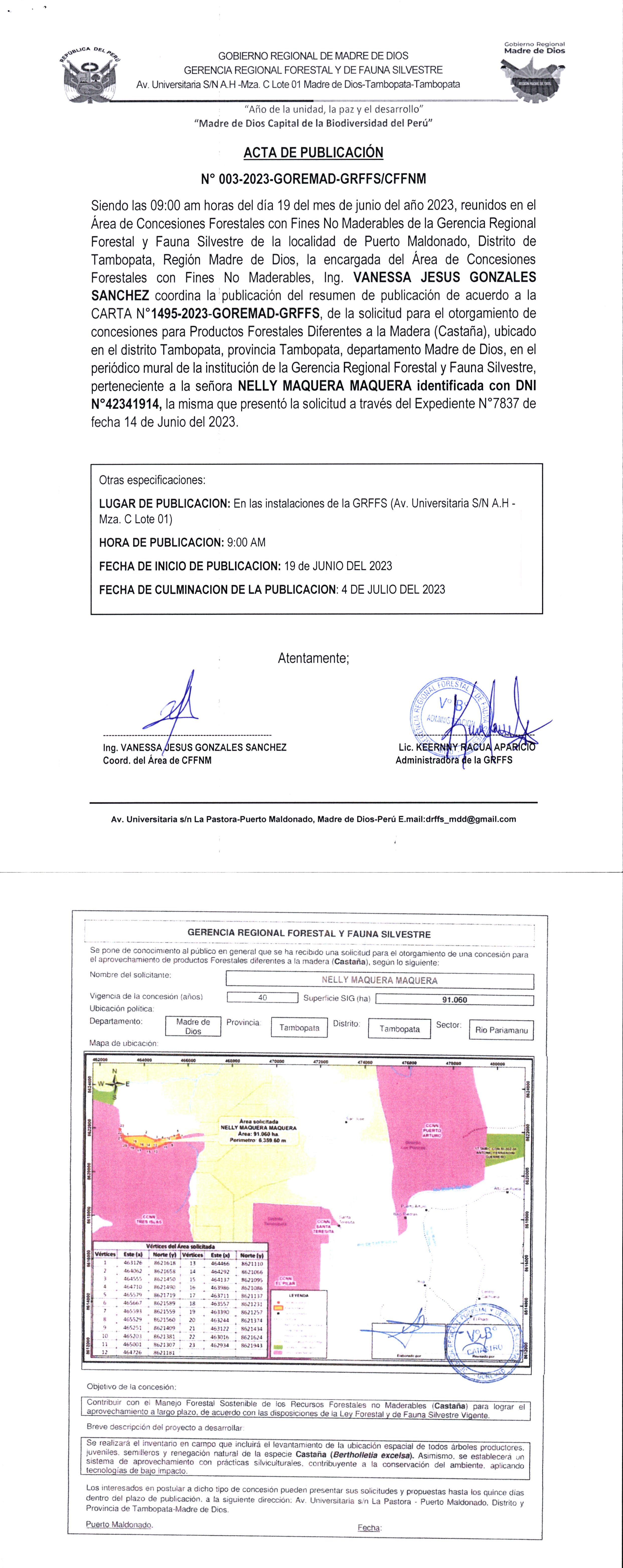 Publicación de solicitud de área para otorgamiento de Contrato de Concesión para Productos Forestales Diferentes a la Madera (castaña)