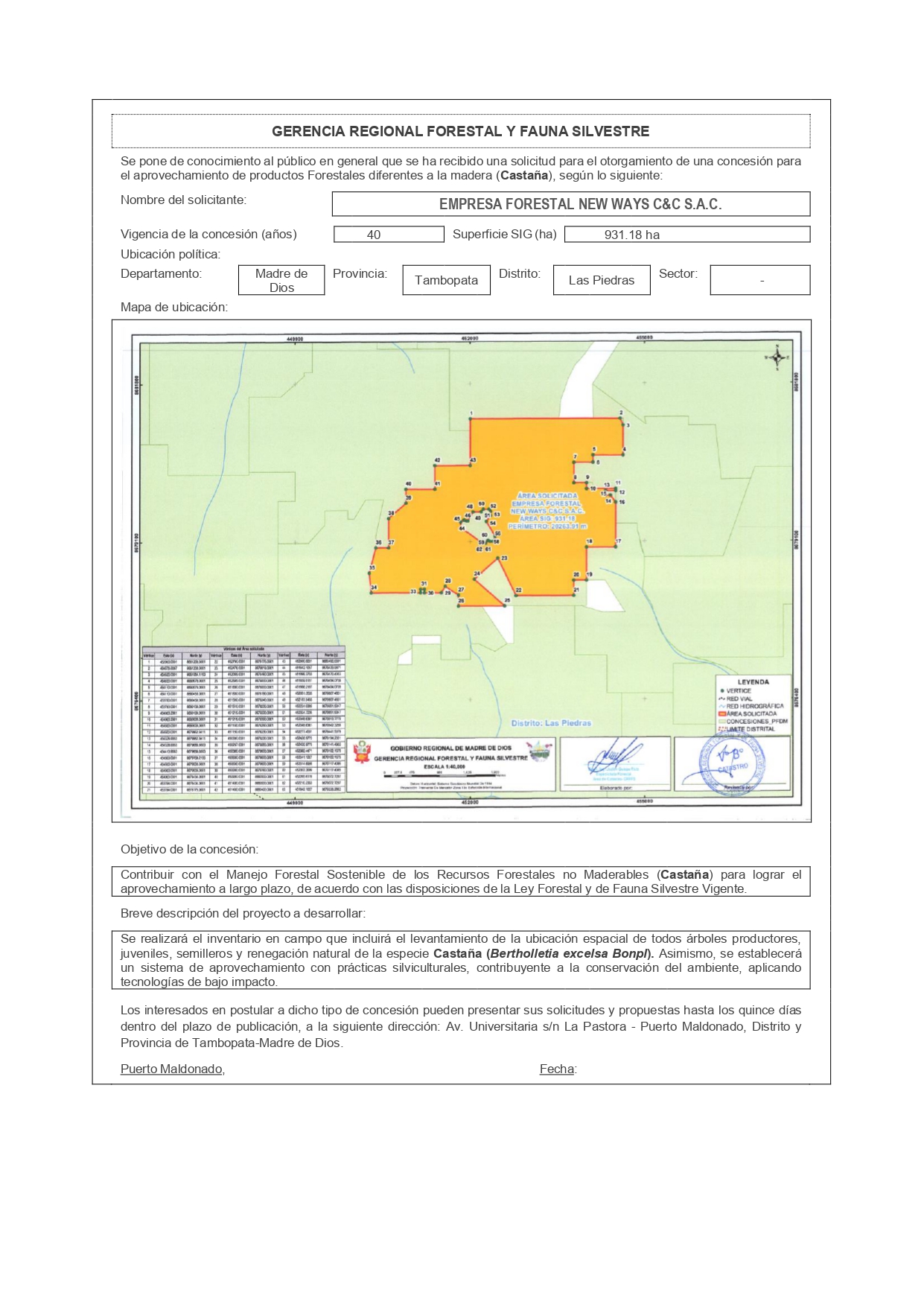 Resumen de la solicitud de área de otorgamiento de Contrato de Concesión para Productos Forestales Diferentes a la Madera (castaña), presentado por la administrada EMPRESA FORESTAL NEW WAYS C&C S.A.C.
