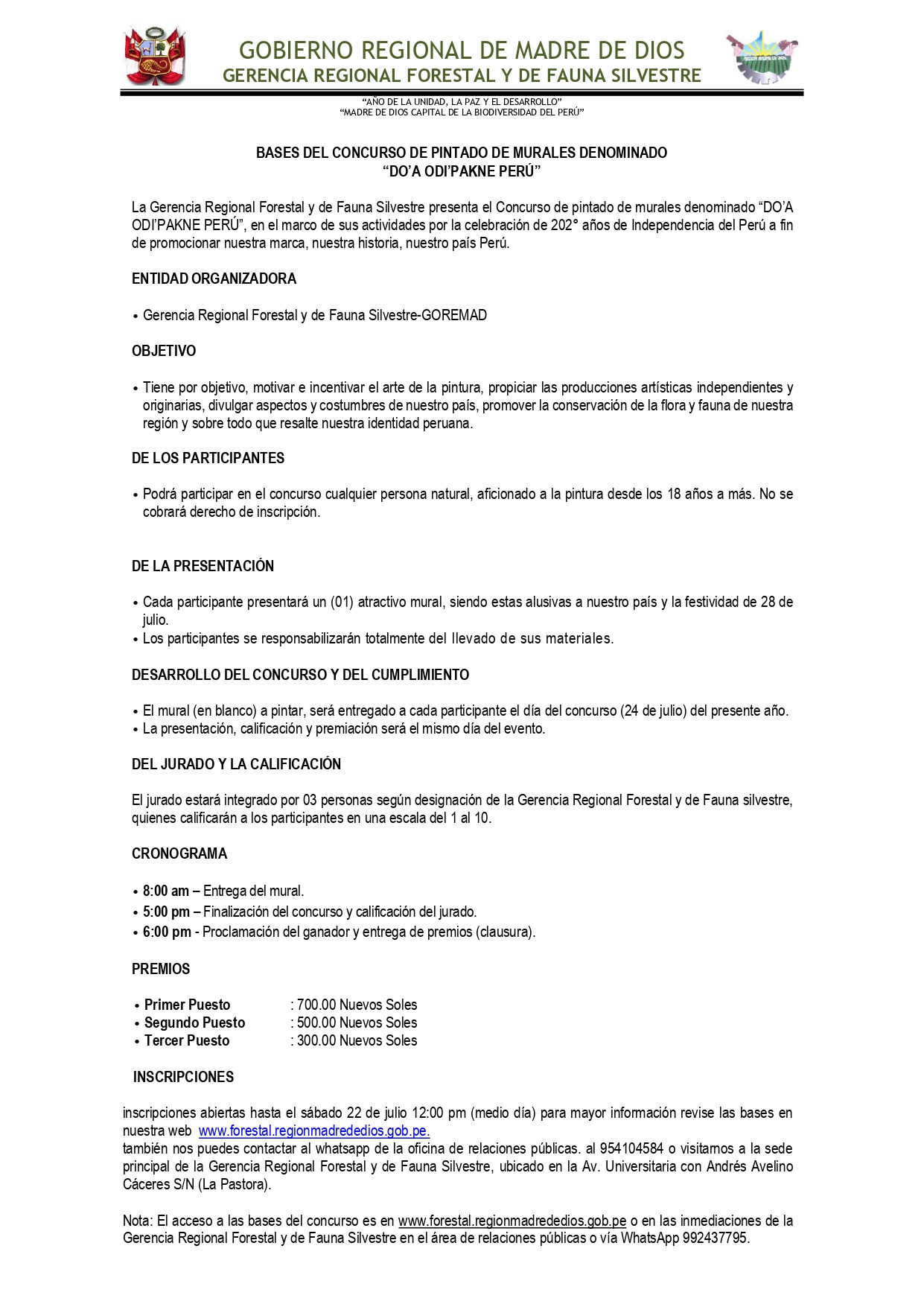 Se hace de conocimiento público las bases para el concurso de pintado de murales realizado por la Gerencia Regional Forestal y Fauna Silvestre.