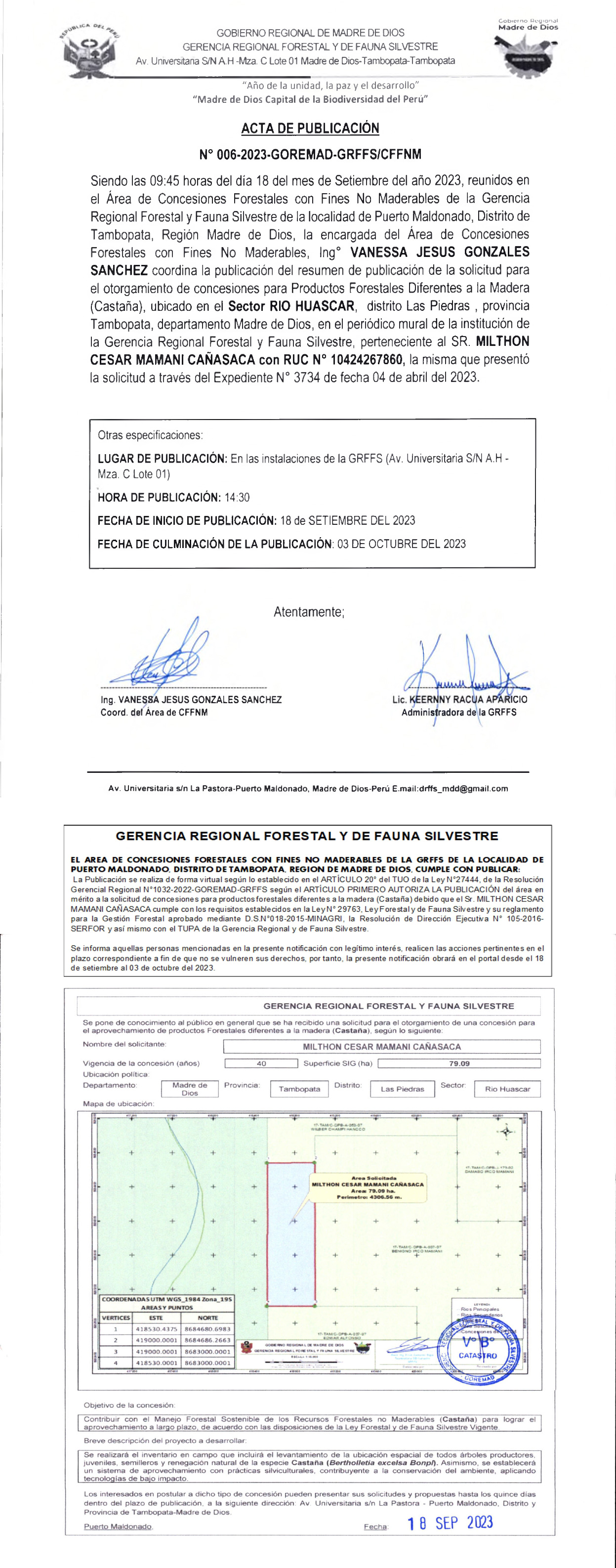 El área de Concesiones Forestales con Fines no Maderables No Maderables de la Gerencia Regional Forestal y de Fauna Silvestre de Madre de Dios hace público la solicitud para el otorgamiento de concesiones para Productos Forestales Diferentes a la Madera (Castaña), ubicado en el Sector RÍO HUASCAR, distrito de Las Piedras, provincia Tambopata, departamento de Madre de Dios, perteneciente al SR. MILTHON CESAR MAMANI CAÑASACA con RUC N° 10424267860.