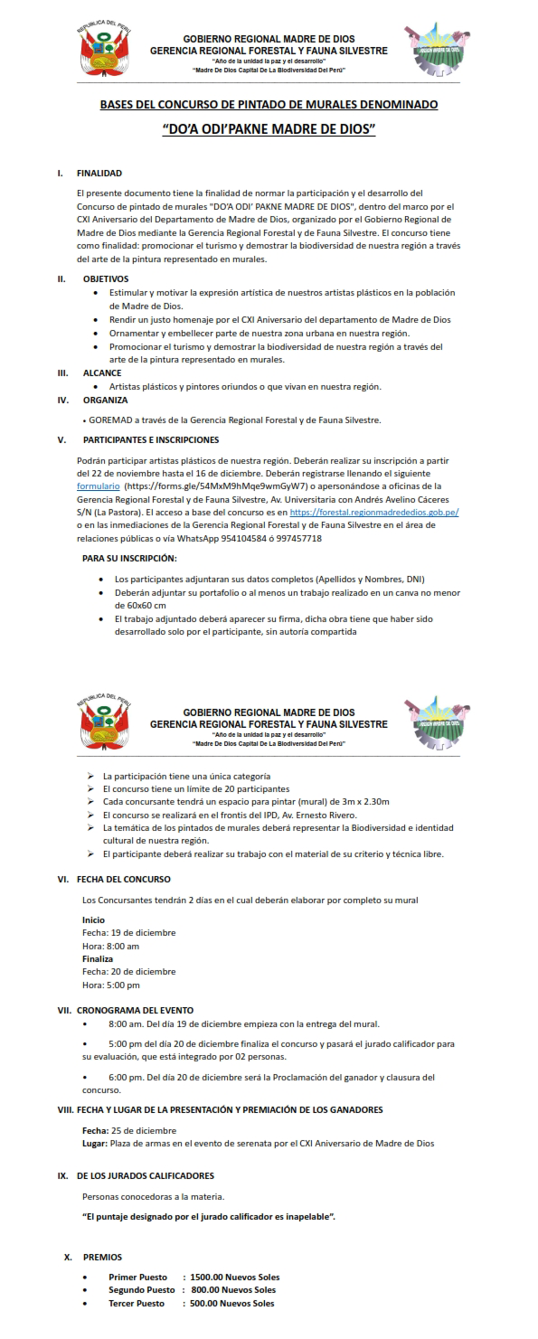 EN MARCO DE LA CELEBRACIÓN DEL CXI ANIVERSARIO DEL DEPARTAMENTO DE MADRE DE DIOS SE REALIZARÁ EL CONCURSO DE PINTADO DE MURALES AMAZÓNICO "DO'A ODI' PAKNE MADRE DE DIOS"