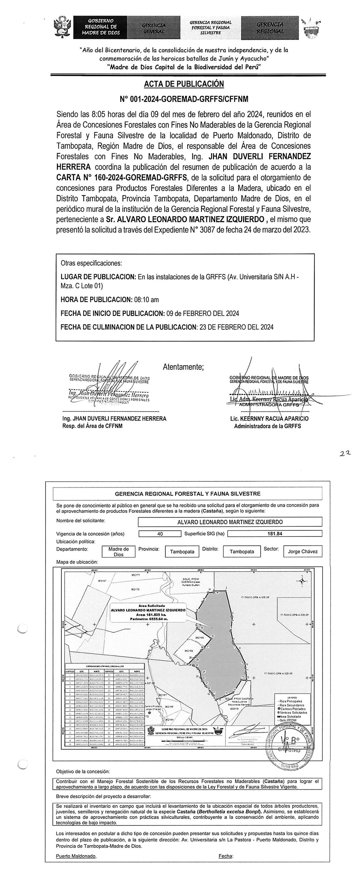Se pone de conocimiento al público en general que se ha recibido una solicitud para el otorgamiento de una concesión para el aprovechamiento de productos forestales diferentes a la madera (castaña)
