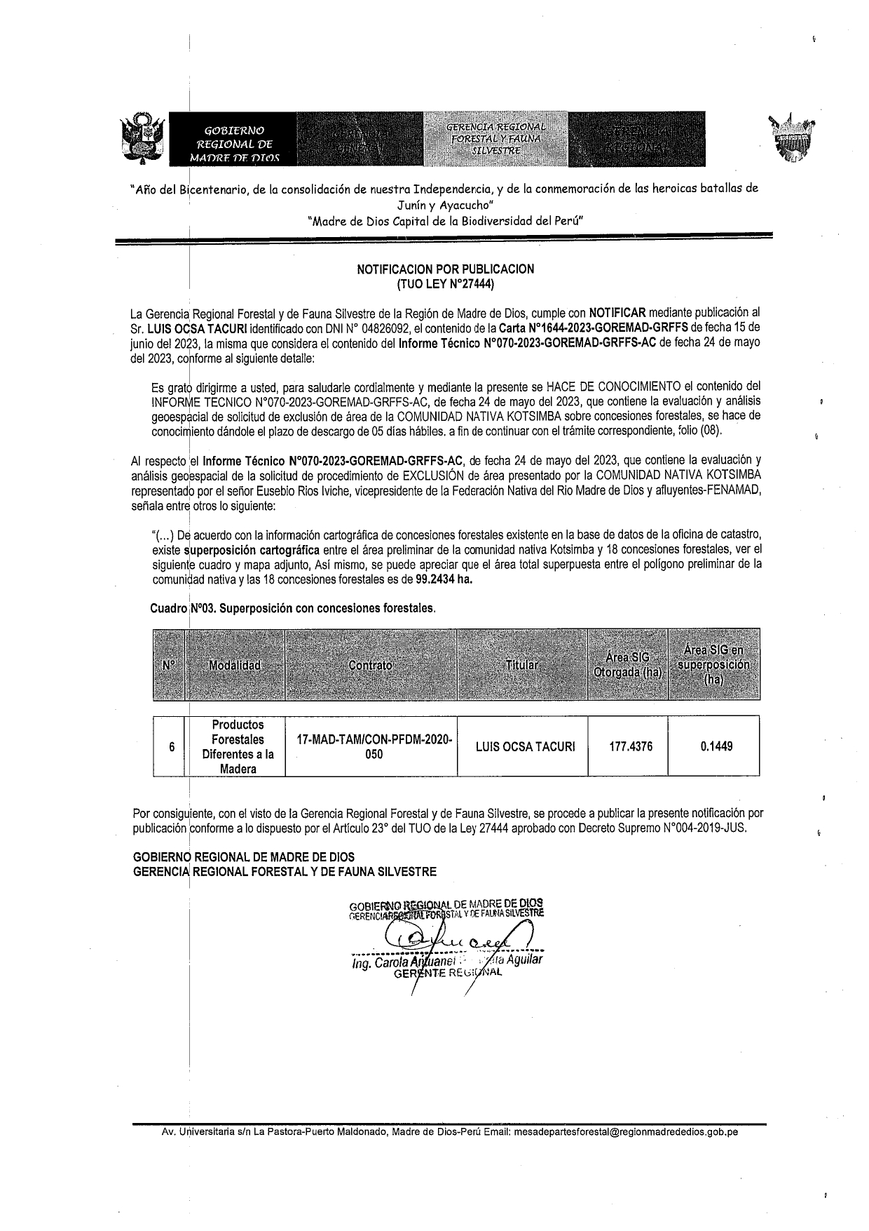 NOTIFICACION Nº070-2023-GOREMAD-GRFFS-AC. ADMINISTRADO LUIS OCSA TACURI.
