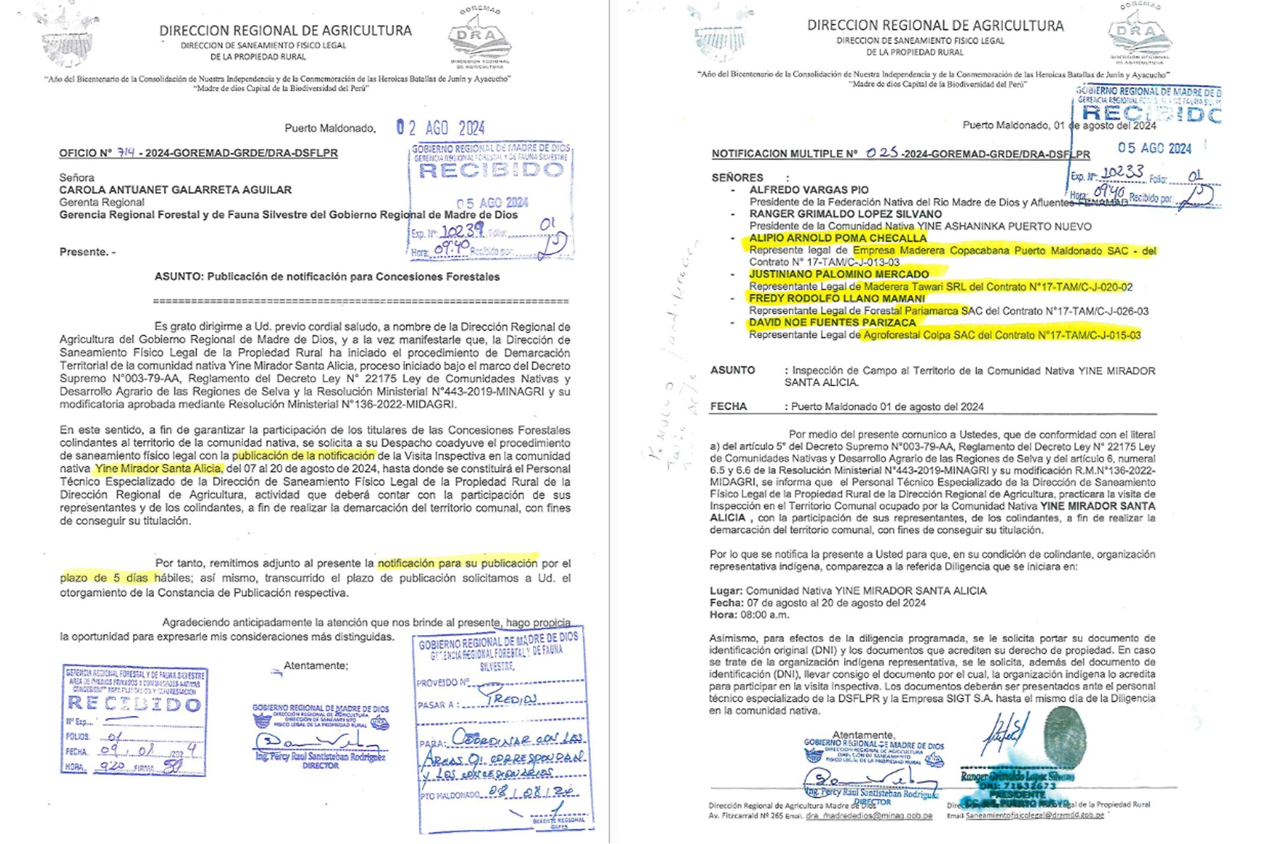 NOTIFICACIÓN MULTIPLE N.º 025-2024-GOREMAD- GRDE/DRA-DSFLPR INSPECCIÓN EN LA COMUNIDAD NATIVA YINE MIRADOR SANTA ALICIA.