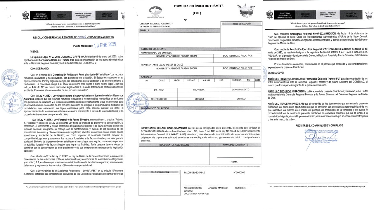 RESOLUCION GERENCIAL REGIONAL Nº001-2025-GOREMAD-GRFFS. OPINION LEGAL Nº23-2025-GOREMAD-GRFFS-OAJ SOBRE LA APROBACION DEL FORMULARIO UNICO DE TRAMITE- FUT PARA LA PRESENTACION DE LOS ACTOS ADMINISTRATIVOS ANTE LA GERENCIA REGIONAL FORESTAL Y DE FAUNA SILVESTRE DEL GOREMAD.