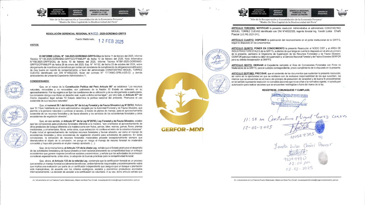 RESOLUCION GERENCIAL REGIONAL Nº0233-2025-GOREMAD-GRFFS EN FAVOR DEL ADMINISTRADO CONSTANTINO MIGUEL TORREZ CUEVAS.