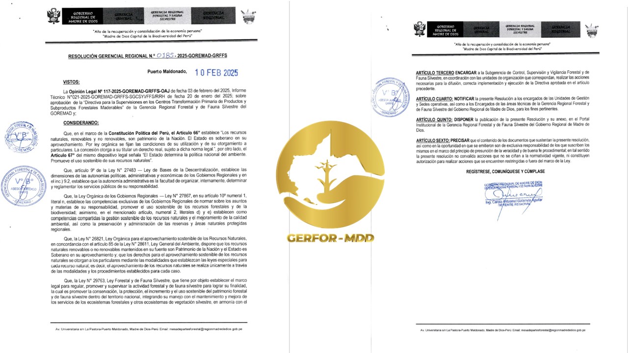 LA OPINION LEGAL Nº 117-2025-GOREMAD-GRFFS-OAJ DE FECHA 03 DE FEBRERO DEL 2025, INFORME TECNICO Nº 021-2025-GOREMAD-GRFFS-SGCSYVFFS/RRH DE FECHA 20 DE ENERO DEL 2025; SOBRE APROBACION DE LA "DIRECTIVA PARA LA SUPERVISIONES EN LOS CENTROS DE TRANSFORMACION PRIMARIA DE PRODUCTOS Y SUBPRODUCTOS FORESTALES MADERABLES" DE LA GERENCIA REGIONAL FORESTAL Y DE FAUNA SILVESTRE DEL GOREMAD.