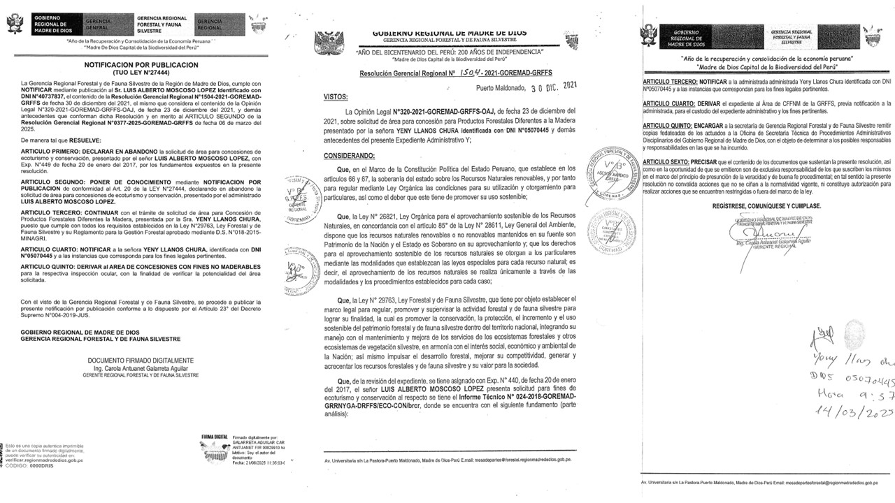 LA Gerencia Regional Forestal y de Fauna Silvestre de la Region Madre de Dios, cumple con notificar mediante publicación al Sr. LUIS ALBERTO MOSCOSO LOPEZ identificado con DNI Nº40737837, el contenido de la Resolución Gerencial Regional Nº1504-2021-GOREMAD-GRFFS de fecha 30 de diciembre del 2021, el mismo que considera el contenido de la Opinión Legal Nº320-2021-GOREMAD-GRFFS-OAJ, de fecha 23 de diciembre del 2021, y demás antecedentes que conforman dicha Resolución y en merito ala ARTICULO SEGUNDO de la Resolución Gerencial Regional Nº0377-2025-GOREMAD-GRFFS de fecha 06 de marzo del 2025.