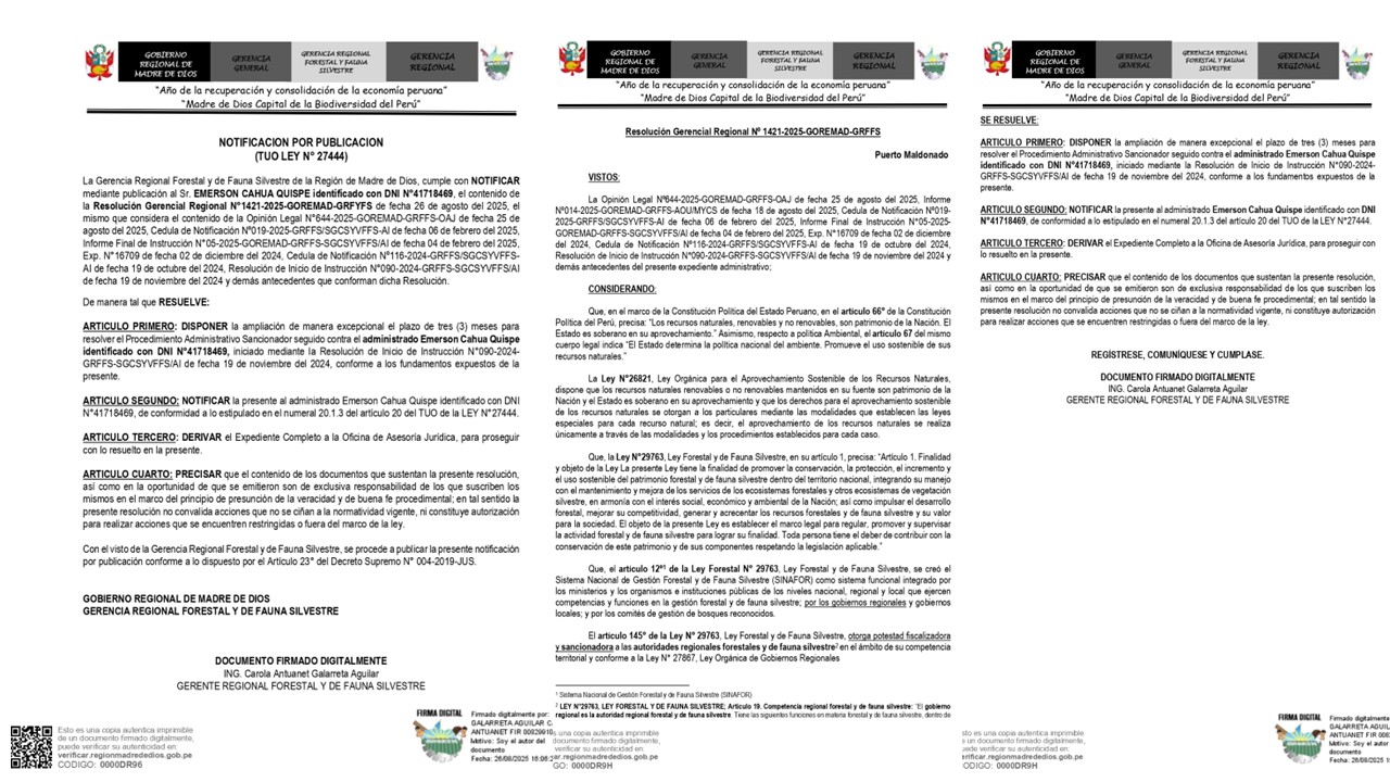 La Gerencia Regional Forestal y de Fauna Silvestre de la Región Madre de Dios, cumple con NOTIFICAR mediante publicación al Sr. EMERSON CAHUA QUISPE identificado con DNI Nº41718469, el contenido de la Resolución Gerencial Regional Nº1421-2025-GOREMAD-GRFFS de fecha 26 de agosto del 2025 el mismo que considera el contenido de la Opinión Legal N.º 644-2025-GOREMAD-GRFFS-OAJ de fecha 25 de agosto del 2025, Cedula de Notificación Nº019-2025-GRFFS/SGCSYVFFS-AI de fecha 06 de febrero del 2025, Informe Final de Instrucción Nº05-2025-GRFFS/SGCSYVFFS-AI de fecha 04 de febrero de 2025, EXP. Nº16709 de fecha 02 de diciembre del 2024, Cedula de Notificación Nº116-2024-GRFFS/SGCSYVFFS-AI de fecha 19 de octubre del 2024, Resolución de Inicio de Instrucción N.º 090-2024-GRFFS-SGCSYVFFS/AI de fecha 19 de noviembre del 2024 y demás antecedentes que conforman dicha Resolución.